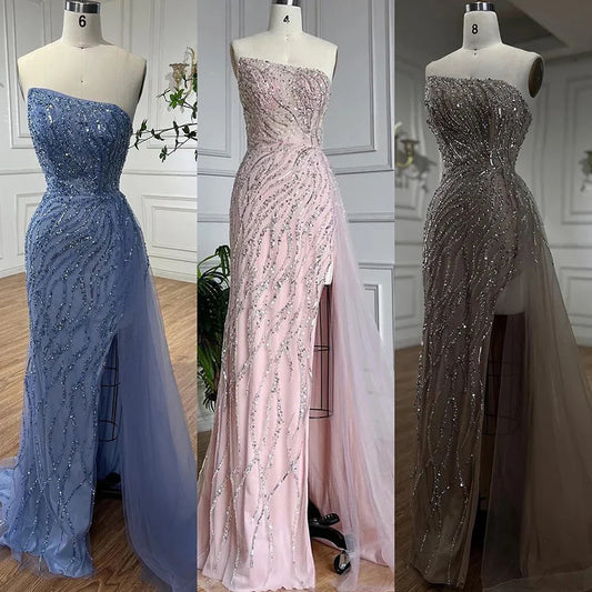 Vestido de noche azul con abertura alta y falda de sirena, sin tirantes y con cuentas, para mujer, fiesta 2025 LA71795