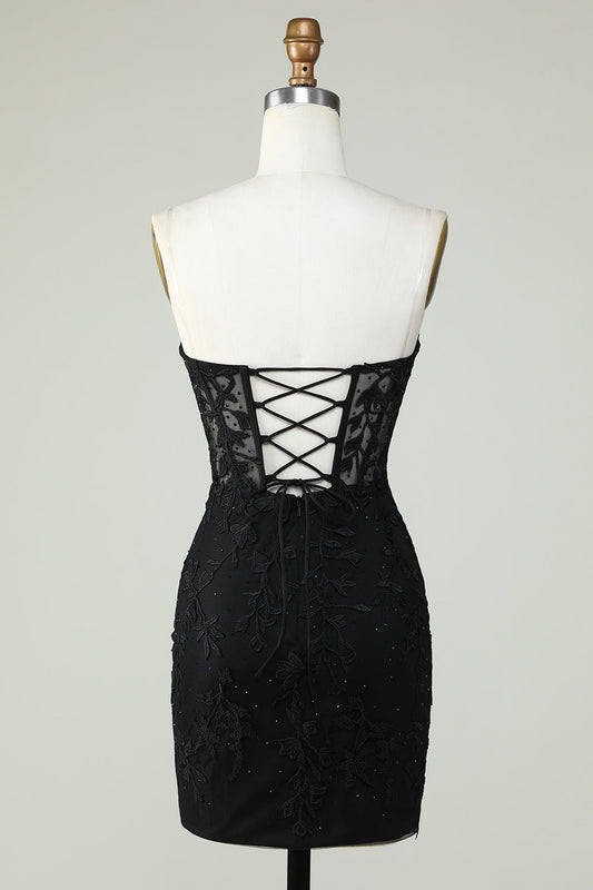 Vestido de fiesta corto ajustado con escote en forma de corazón, color negro, con apliques