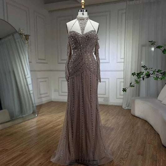 Vestidos de noche elegantes de sirena color caramelo, sin mangas, con cuello halter y guantes, con cuentas, 2025, LA72232
