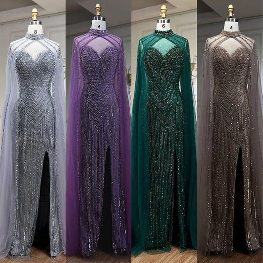Vestidos de noche de sirena color caramelo con mangas capa, vestidos de fiesta árabes de lujo con cuentas 2025 para mujer LA72053A