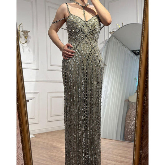 Vestido de noche de lujo con cuentas y tirantes finos, estilo sirena color caramelo, para mujer, ideal para bodas 2025, LA71849