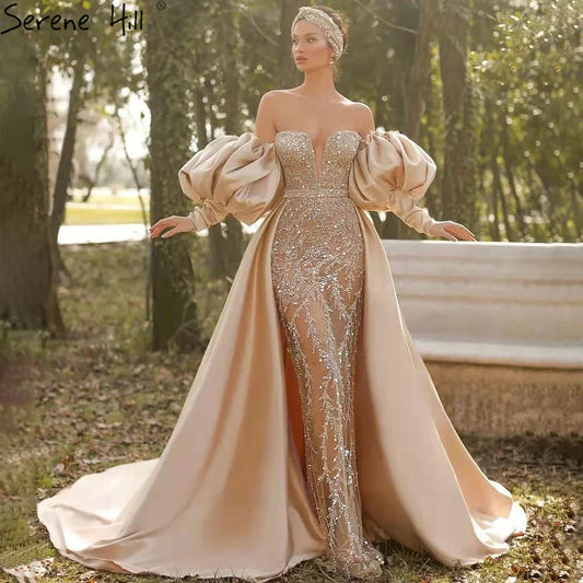 Vestidos de noche largos de sirena de lujo color champán con mangas abullonadas y elegantes para mujer para fiesta LA71120