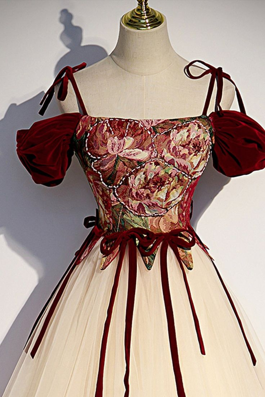 Vestido de fiesta largo con tirantes finos de tul color champán, corte A, Y7952