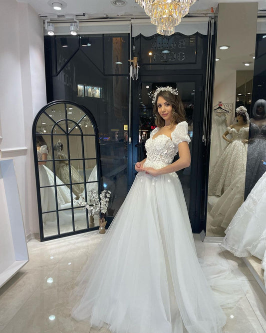 Elegante vestido de novia de tul con escote en forma de A, mangas cortas y escote en forma de corazón