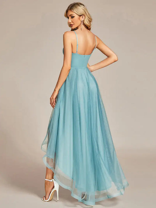 Elegante vestido de noche con apliques de malla, corte alto y bajo, cremallera oculta, largo hasta la rodilla, color azul polvoriento, para dama de honor.
