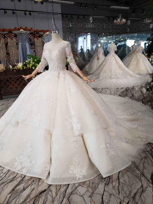Elegante vestido de novia de media manga con escote corazón y encaje WD379