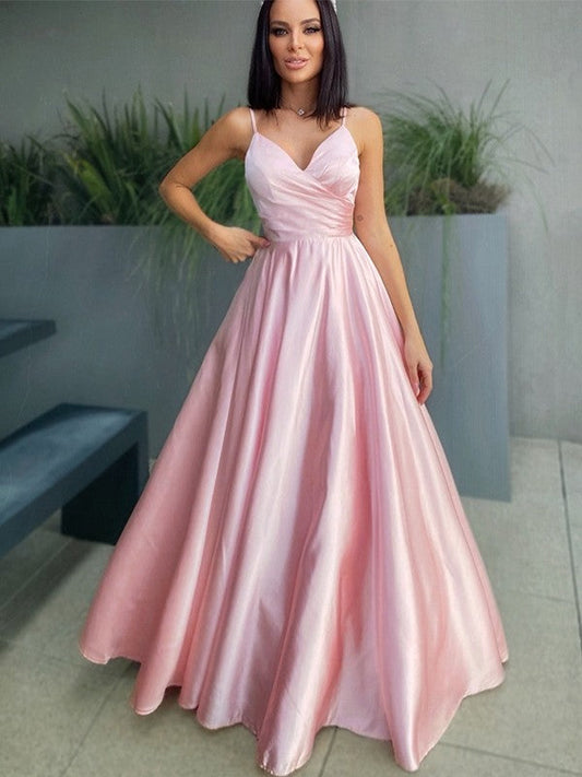 A-line Pink Spaghetti-Straps V-neck Long Prom Dress