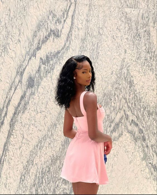 Vestido de fiesta corto de satén rosa con corte A y espalda descubierta, vestido de bienvenida PD311
