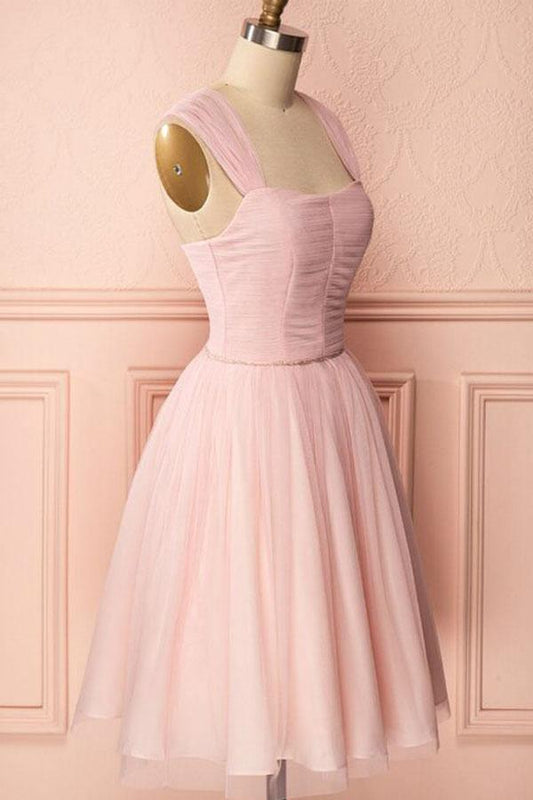 Vestido corto de fiesta de tul rosa con tirantes, pliegues y cuentas, corte A, PD274
