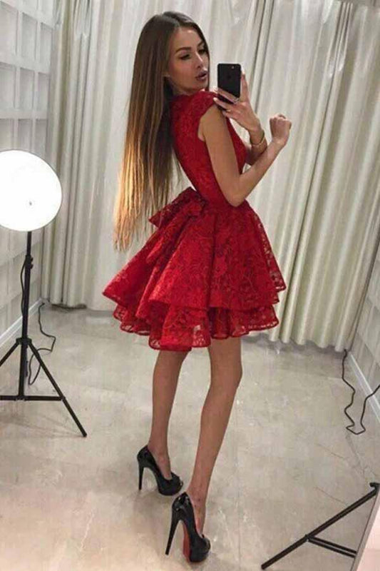 Vestido corto de fiesta de bienvenida con encaje rojo, cuello redondo y corte A PD228