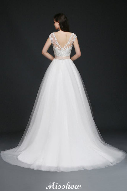 Vestidos de novia glamurosos de tul con cola de corte A y fajín