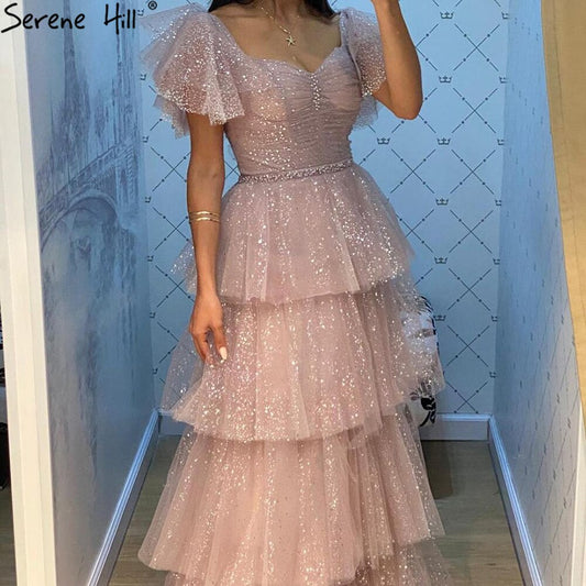 Vestidos de noche rosas sexys de lujo, corte A, brillantes, con capas, estilo princesa, para mujer, fiesta, LA70924