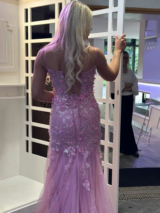 Reuben | Vestido de fiesta largo estilo sirena con tirantes finos en color rosa y apliques de encaje
