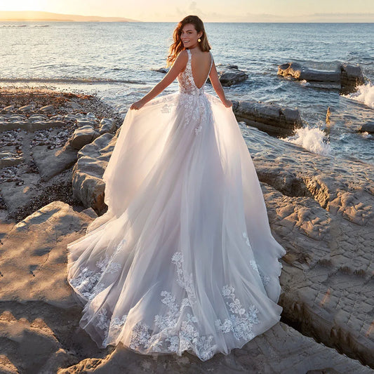 Vestidos de novia sexys con escote en V profundo, mangas cortas, espalda descubierta, elegantes apliques de encaje de tul, corte A