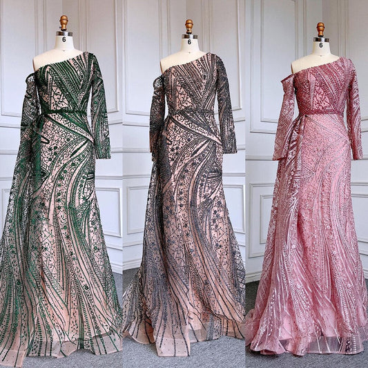 Vestido de noche elegante de sirena rosa sexy con un hombro al descubierto y sobrefalda, de lujo, con cuentas, para mujer, fiesta, LA71771