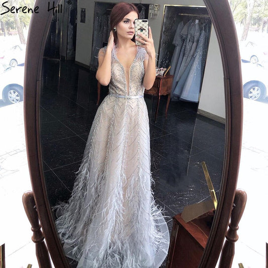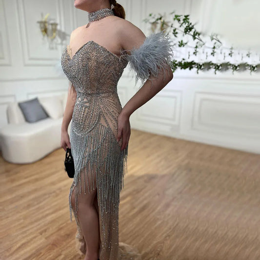 Vestidos de noche de lujo color nude plateados, 2025, con plumas y abalorios, corte en A, sexys, para mujer, para fiesta, LA70835