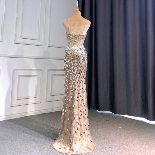 Vestido de noche de lujo con cuentas y corte sirena color plata nude LA72262
