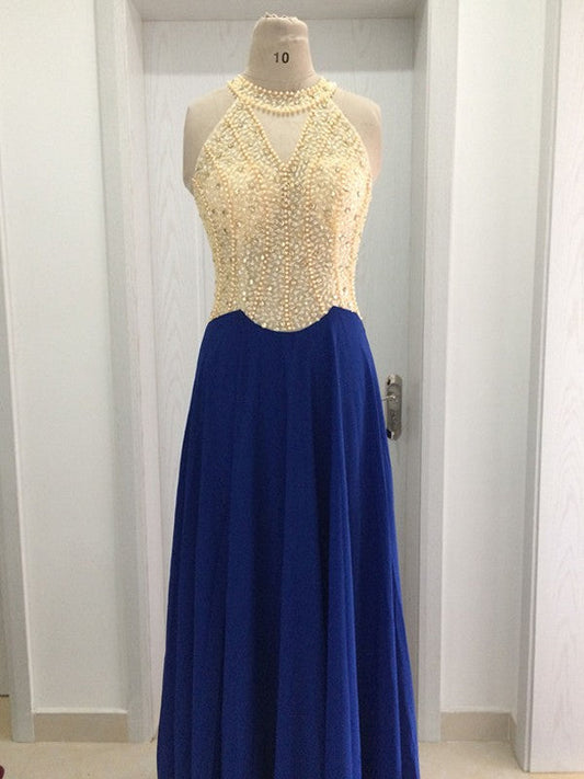Vestidos de fiesta elegantes de corte A/sin mangas con escote redondo, de gasa y cristales hasta el suelo