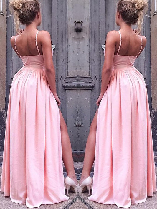 Vestidos de fiesta elegantes de satén tipo seda, con corte A, sin mangas, tirantes finos y fruncidos hasta el suelo