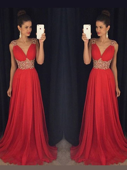 Vestidos de fiesta elegantes de gasa con escote en V, sin mangas y corte A, largos hasta el suelo, con cuentas