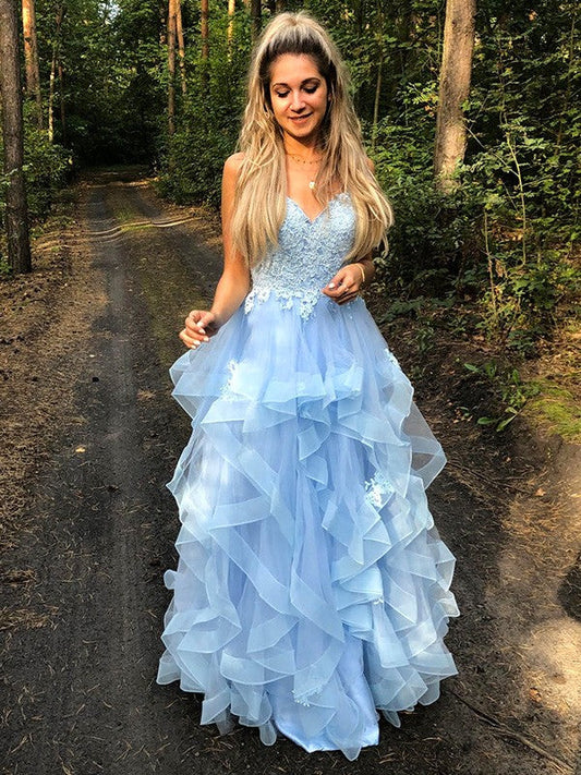 Vestidos de fiesta elegantes de corte A con tirantes finos, sin mangas, apliques de organza y largo hasta el suelo