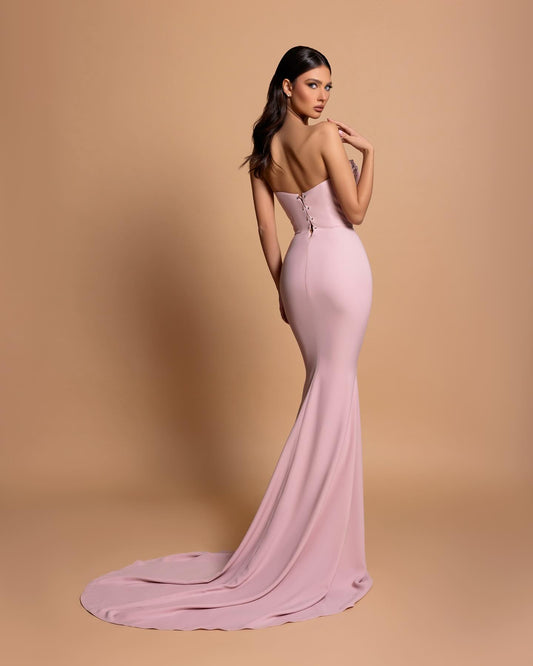 Impresionante vestido de fiesta rosa con escote en V, sin tirantes, sin mangas, de satén con pedrería y espalda abierta y cola.
