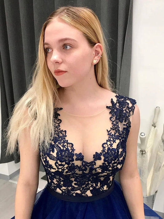Vestidos de fiesta largos de tul con escote en V, lentejuelas y espalda descubierta en azul marino oscuro.