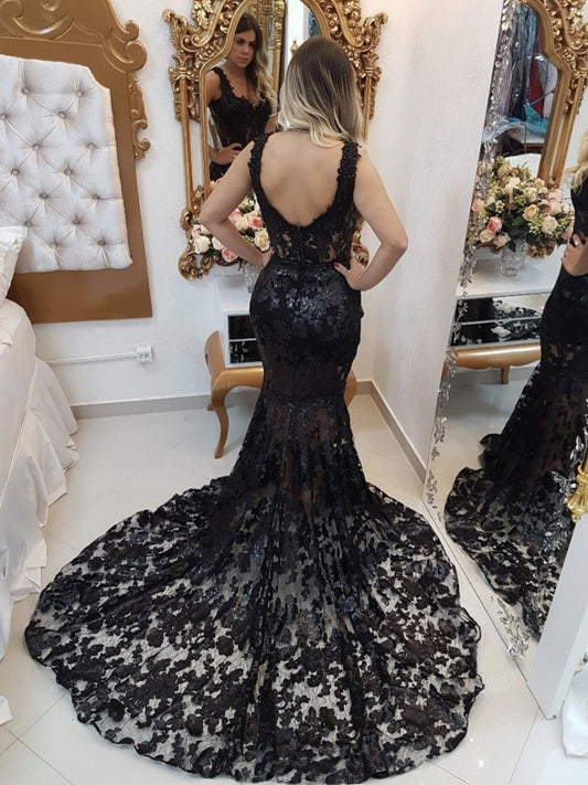Vestidos de fiesta formales de noche con escote corazón y encaje de sirena largos negros