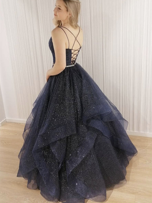 Vestidos de fiesta formales brillantes de corte A largo con escote en V, tul con cuentas y espalda abierta