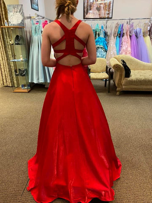 Vestidos de fiesta largos de satén con escote en V, espalda descubierta y bolsillos, vestidos de noche formales de graduación en rojo