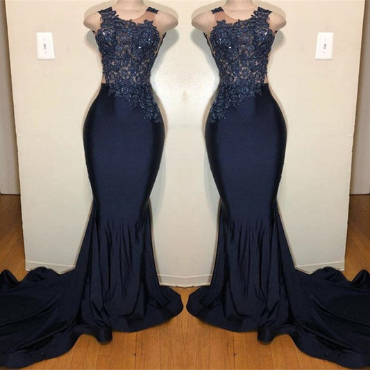 Vestido de fiesta de sirena sin mangas con hombros descubiertos y apliques intrincados
