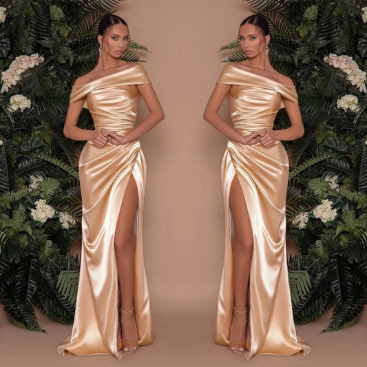 Vestido de fiesta de sirena con hombros descubiertos, abertura y lentejuelas