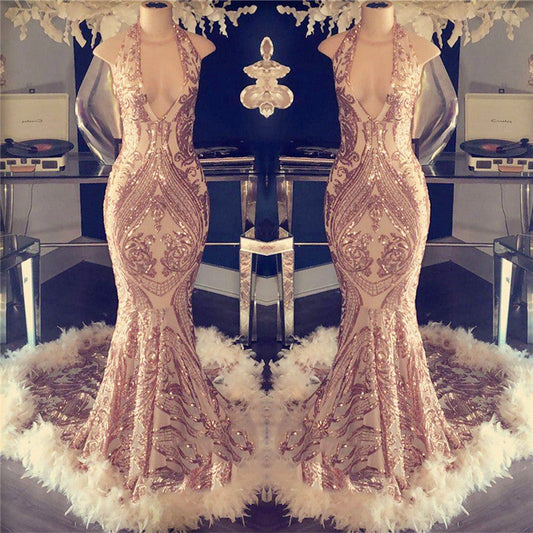 Vestido de fiesta largo estilo sirena con cuello halter, espalda abierta y detalle de plumas