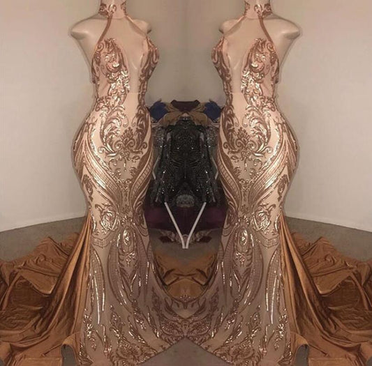 Elegante vestido de fiesta de sirena con escote en V profundo y cuello halter hasta el suelo