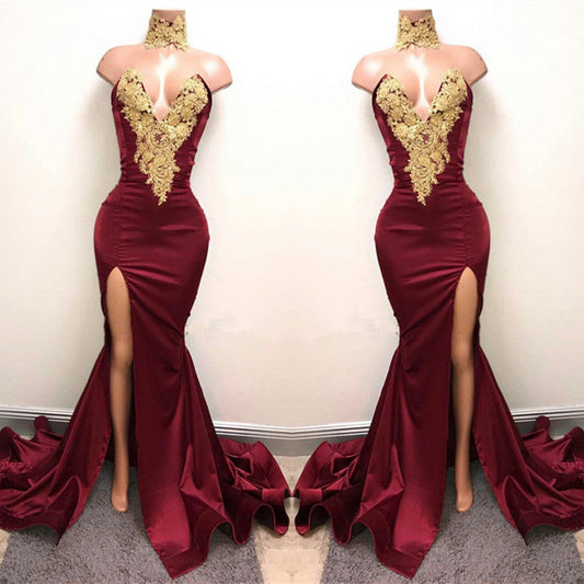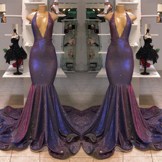 Elegante vestido de noche de sirena con cuello en V y apliques halter