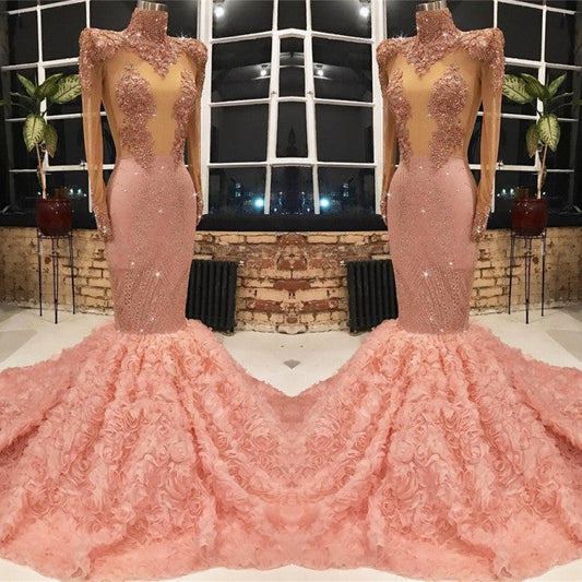 Vestido de fiesta rosa de manga larga con apliques de sirena y flores en la parte inferior