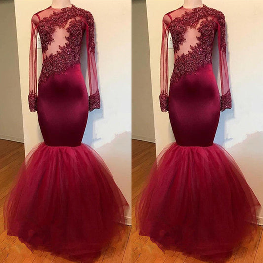 Vestidos de fiesta largos de cuello alto color burdeos con apliques de encaje de sirena y tul transparente