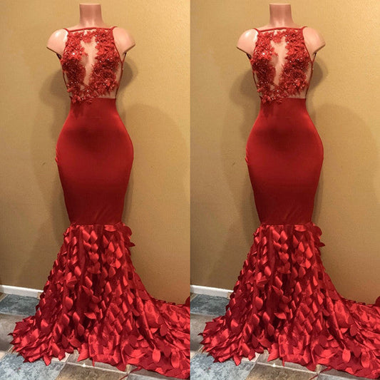 Vestidos de fiesta de manga larga con cuello alto y corte sirena con flores rojas
