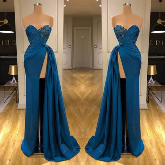 Vestido de fiesta de sirena con escote en forma de corazón de tul, abertura lateral, apliques de encaje y falda desmontable