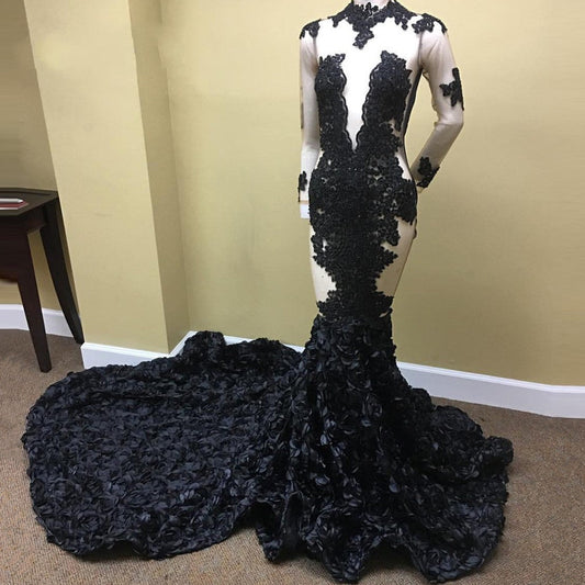 Vestido de fiesta negro sexy de manga larga con encaje y flores en la parte inferior