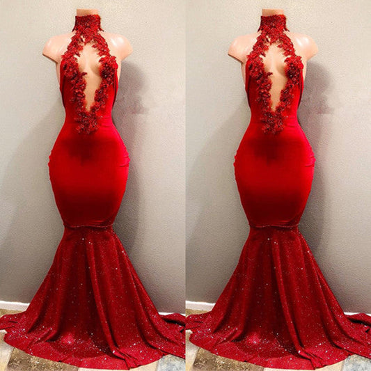 Vestido de fiesta de sirena sexy con cuello alto rojo