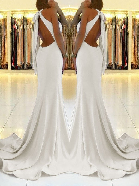 Hermosos vestidos de fiesta de talla grande con escote sirena, mangas largas, apliques, cola de corte, satén tejido elástico