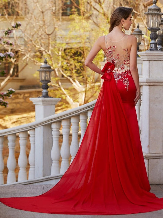 Hermosos vestidos de fiesta de sirena con escote transparente, sin mangas, cola de corte y apliques