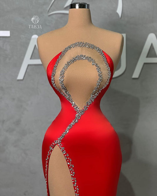 Vestido de fiesta sexy largo rojo de sirena con cuentas, sin mangas y abertura