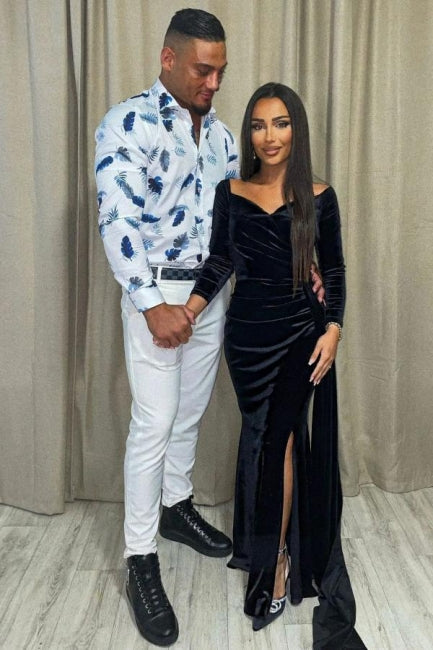 Vestido de fiesta sexy de sirena, largo, negro, con hombros descubiertos, mangas largas y abertura