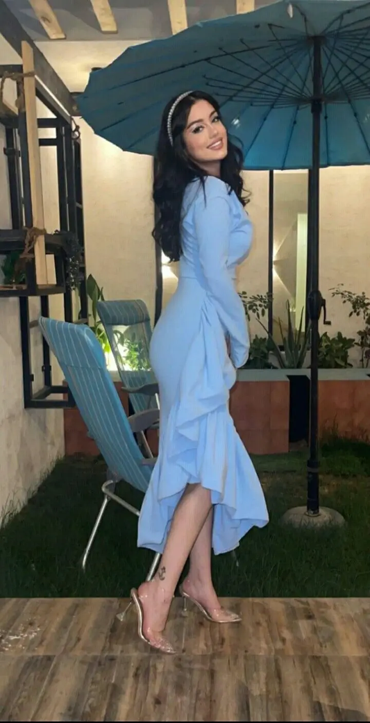 Vestido de fiesta de sirena azul claro para mujer, escote en V, mangas largas, vestido formal para ocasiones especiales, vestido de noche Y4764