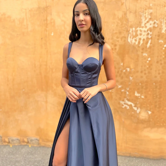 Vestido de fiesta largo de satén azul, vestido de noche azul Y4966