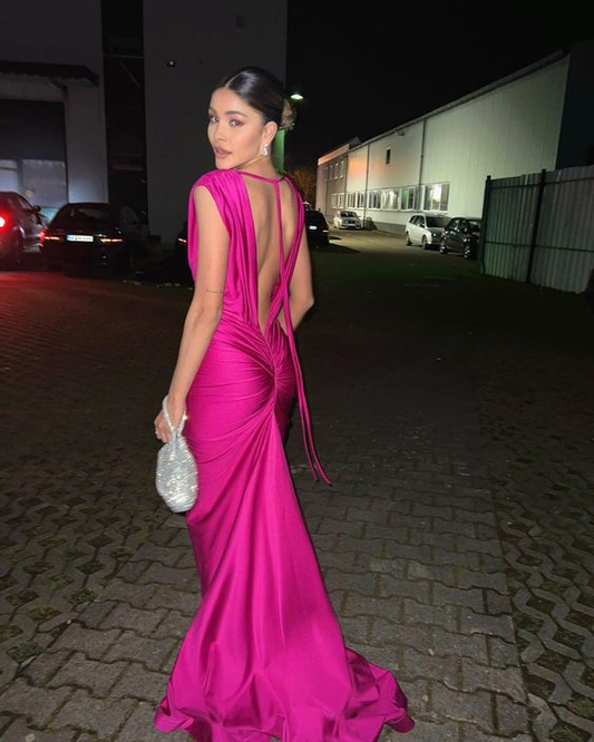 Elegante vestido de noche de satén sirena sin tirantes, rosa intenso, Y5183