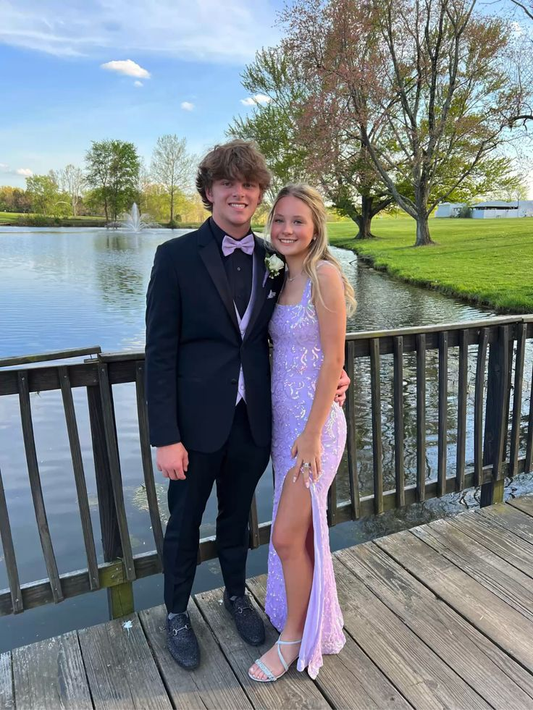 Vestido de fiesta morado brillante con lentejuelas y abertura, vestido de noche morado Y5313