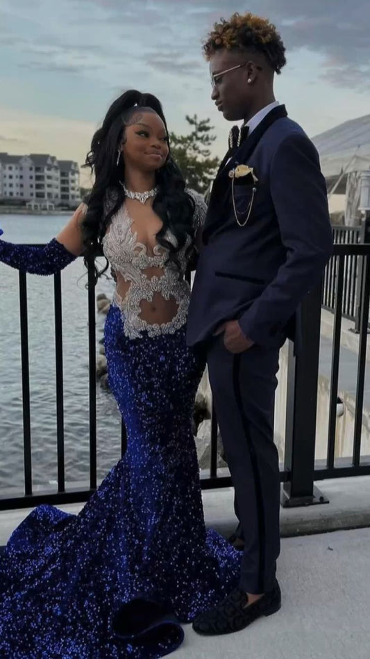 Vestido de fiesta de sirena brillante con lentejuelas azul real, vestido de noche encantador Y1353